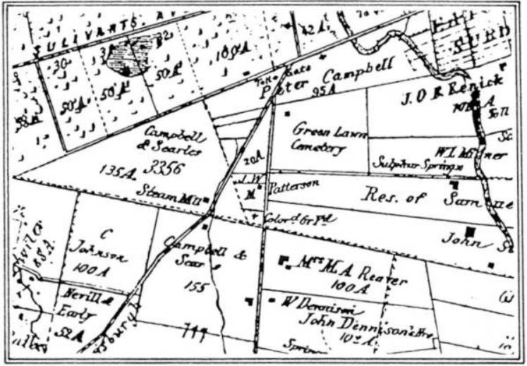 The "Colored Gr Y'd" is shown on this portion of the map of Franklin County by John Graham, Surveyor and Civil Engineer. It was published by R. C. Foote in Philadelphia in 1856. The original size of Green Lawn Cemetery is also shown. 48 |