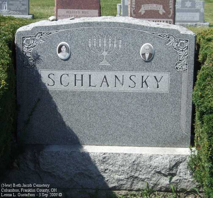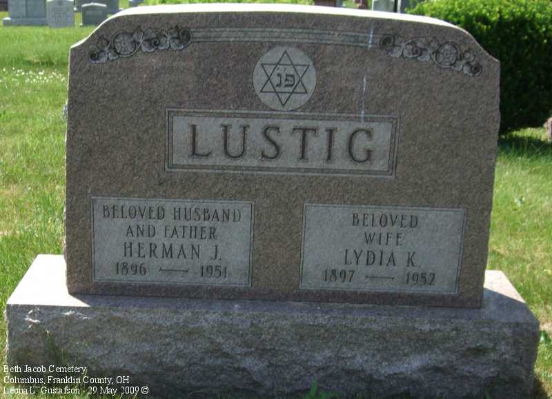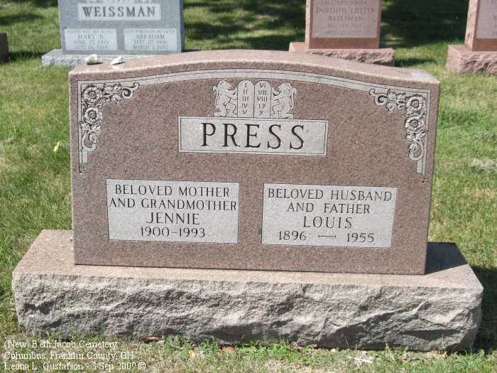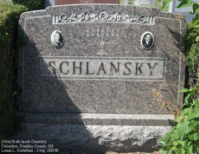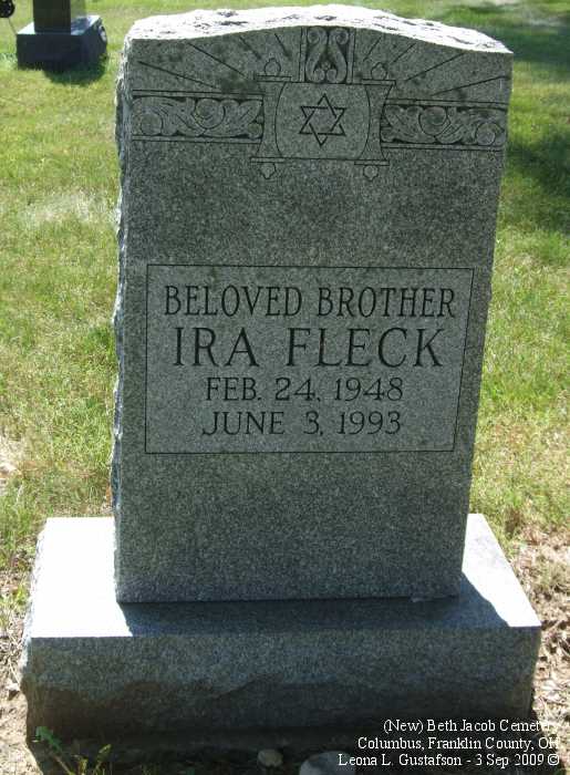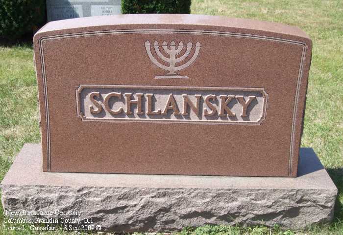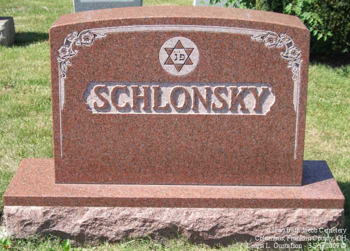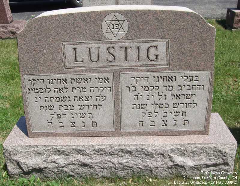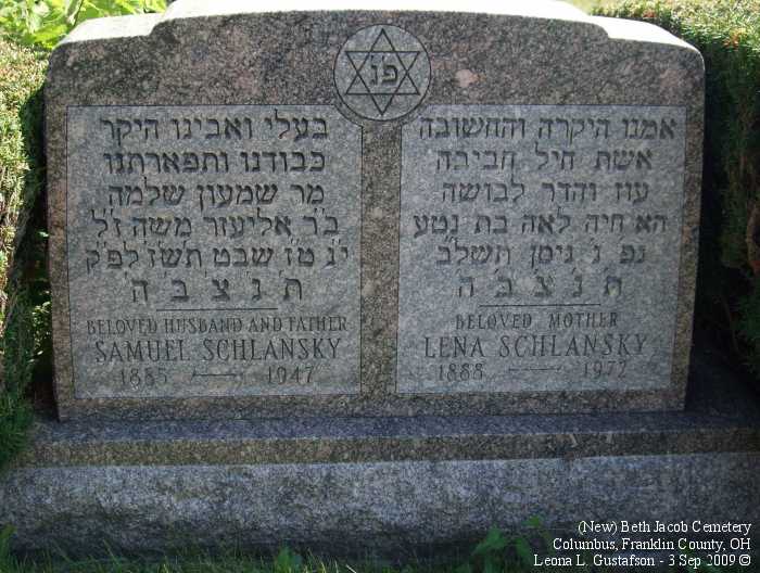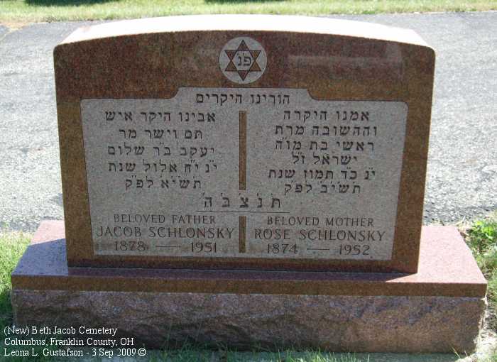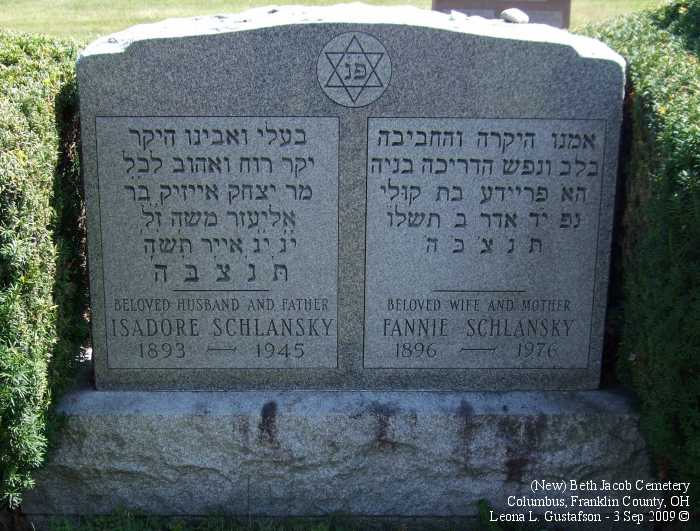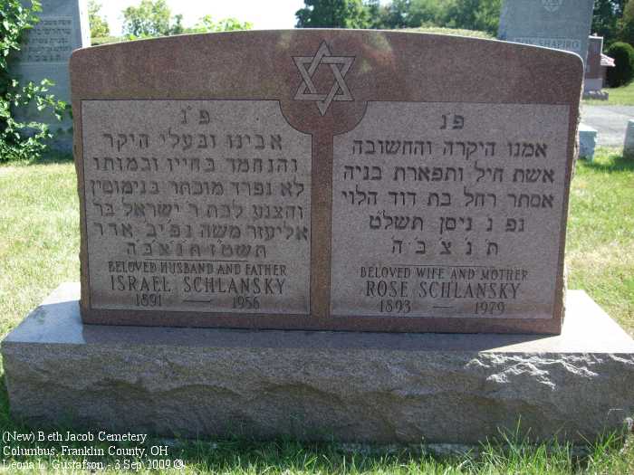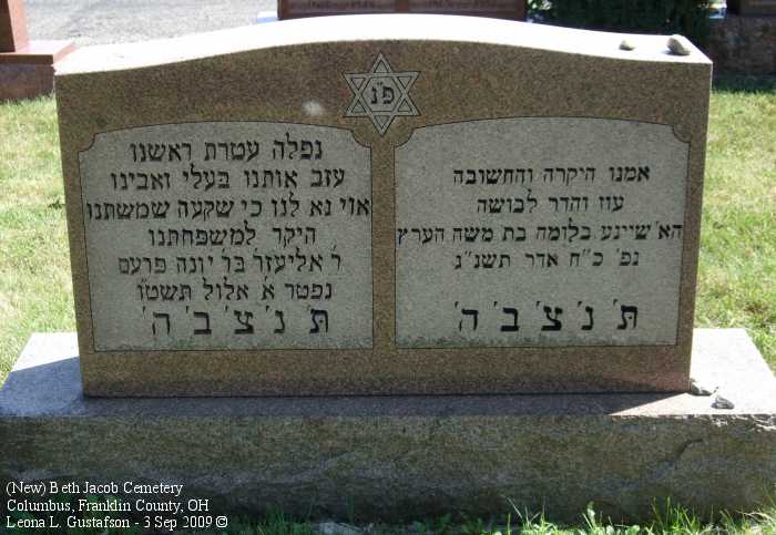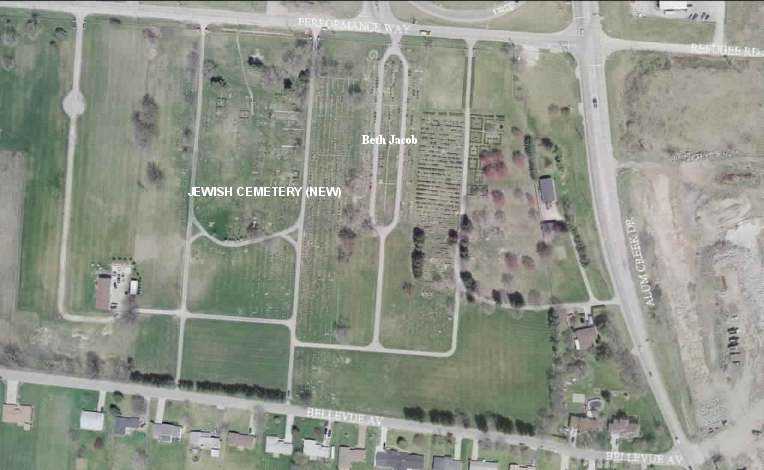 Gravestone PhotographsNew Jewish Cemetery is just south of State Route 104 on the west side of Alum Creek Drive between Performance Parkway on the north and Belvue Avenue on the south. Four congregations maintain separate cemeteries within the one larger cemetery. The photos on this page are from the Beth Jacob Cemetery. For additional information about this and other Jewish cemeteries in Columbus see: Jules J. & Cyril Zisenwine Duga, These are Our People: Burials in Designated Jewish Cemeteries in Columbus, Franklin County, Ohio 1852-1999 (Privately published, 2001). This book was "prepared for and presented to The Columbus Jewish Hisotrical Society," and is also available (reference only) at the Columbus Metropolitan Library Aerial Photo of Cemetery,