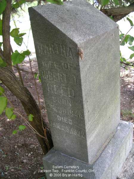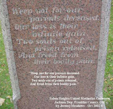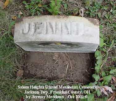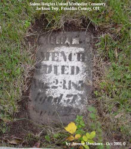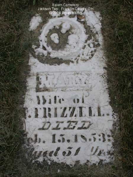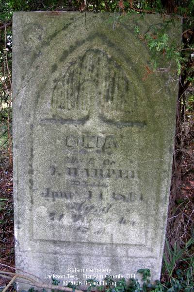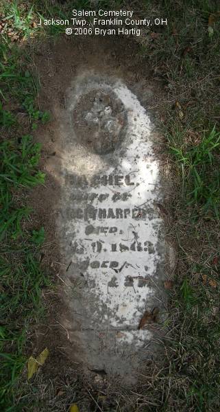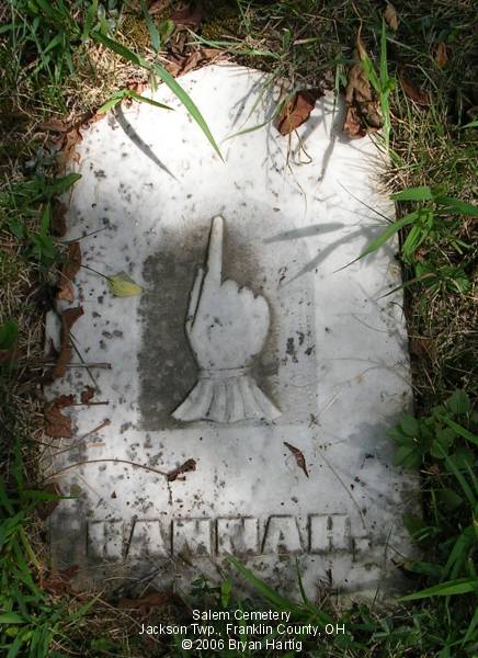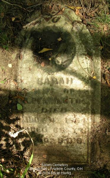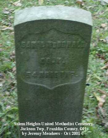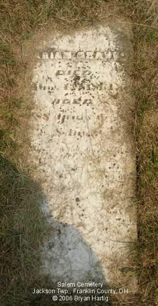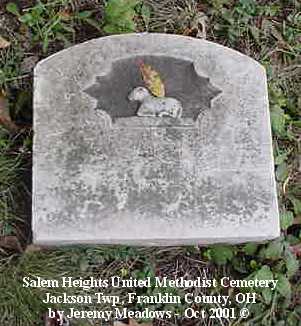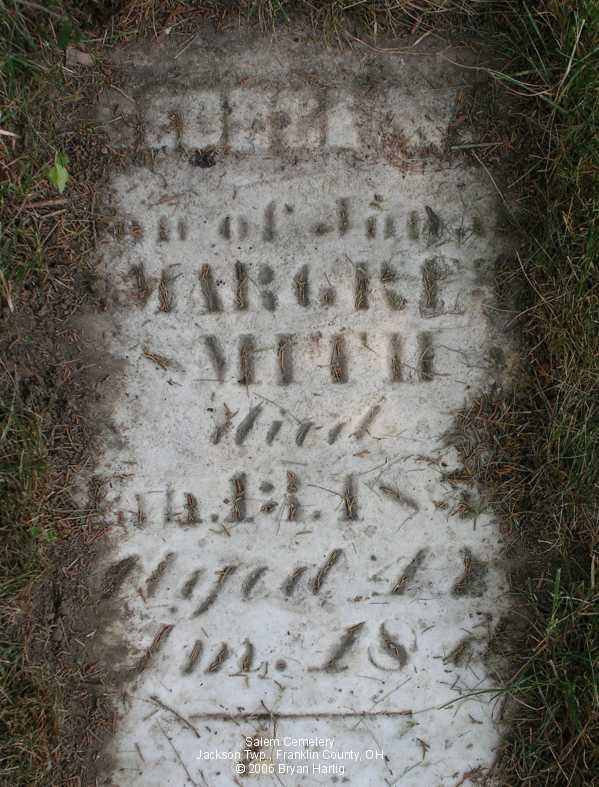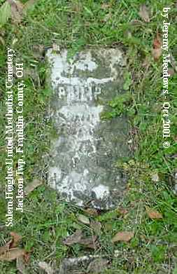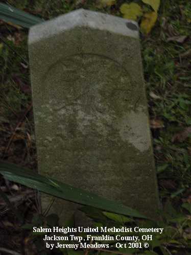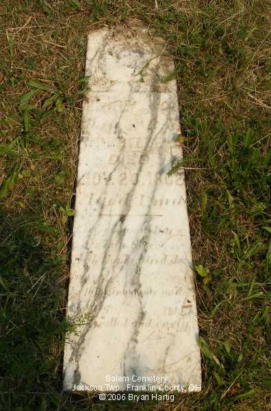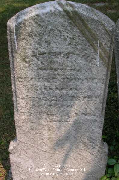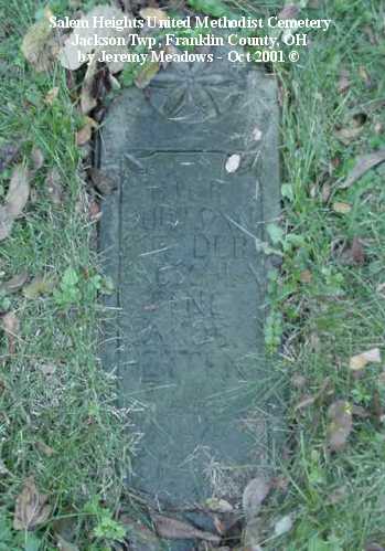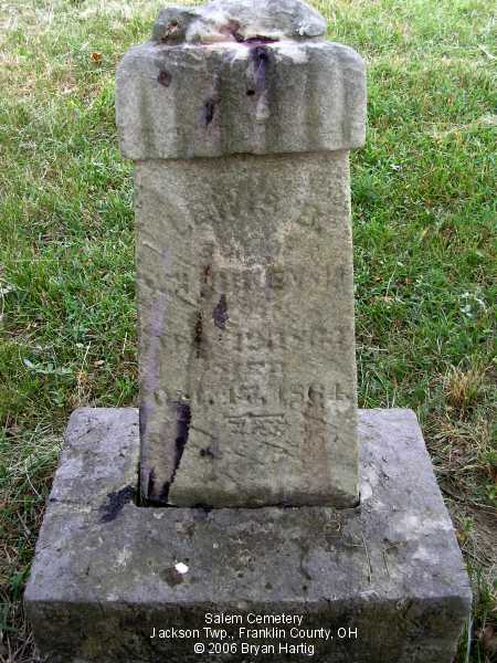 According to the sign pictured above, the cemetery was established in 1843. It is located at the corner of Alkire and Demorest roads, across Alkire Road from the "new" church building located at 4241 Alkire Road. However, that church is no longer affiliated with the cemetery and has none of the cemetery records. The cemetery is cared for by the Jackson Township trustees and seems to be fairly well cared for. The stones date from the early 1850s.