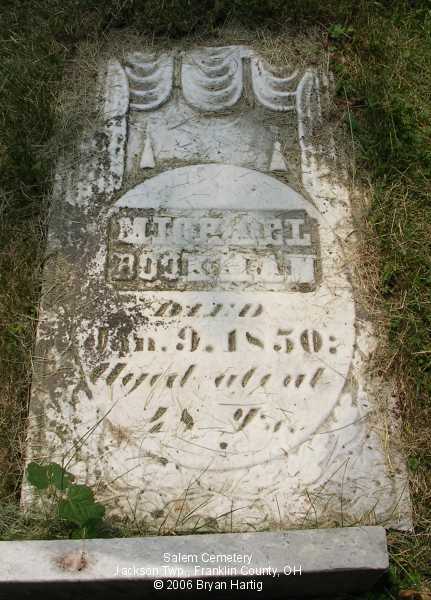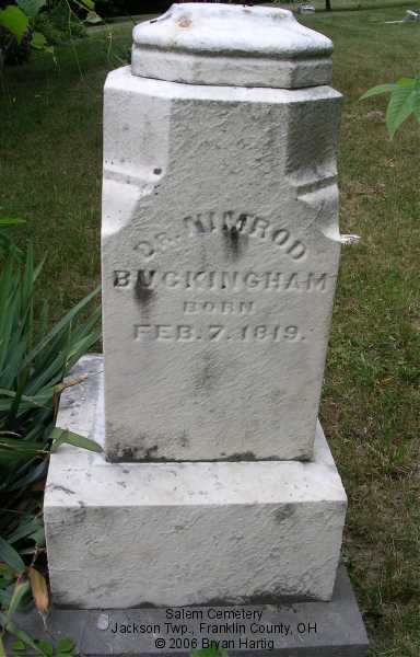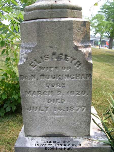 - Buckingham, Dr. Nimrod, Feb 7, 1819-[blank] and, on same stone, Elisabeth, wife of Dr. N., March 3, 1820-July 14, 1877