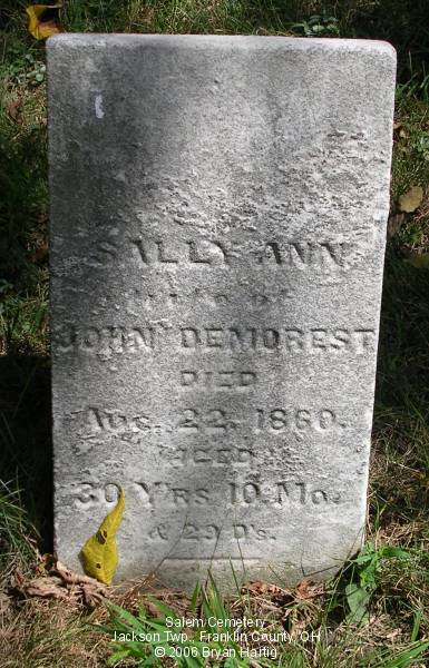 - Demorest, Sally Ann, wife of John, died Aug 22, 1860, aged 30 yrs 10 mo & 29 ds