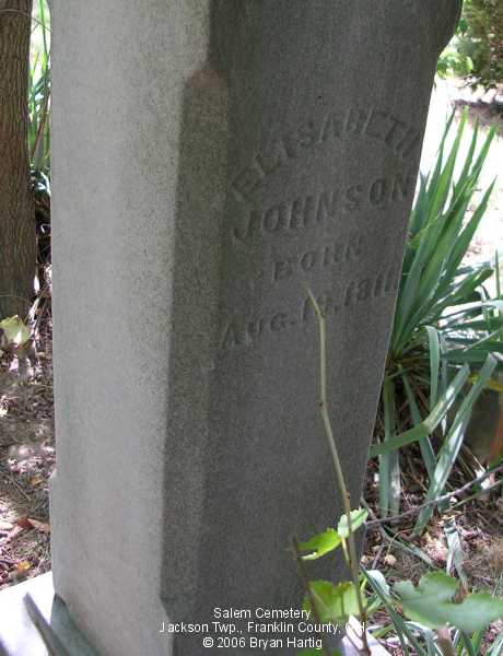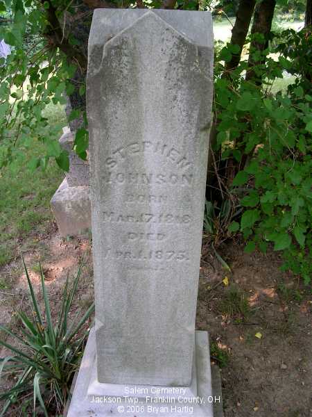 - Johnson, Stephen, Mar 17, 1818-Apr 1, 1875 and, on same stone, Elisabeth, Aug 19, 1811-[blank]