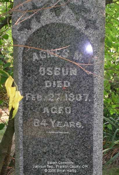 - Osbun, Samuel, died Oct 2, 1866, aged 49 years and, on same stone, Agnes M., died Feb 27, 1907, aged 84 years