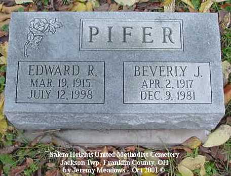 - Pifer, Edward R, Mar 19, 1915-July 12, 1998; and Beverly J, Apr 2, 1917-Dec 9, 1981