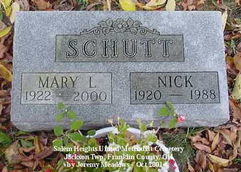 - Schutt, Mary L, 1922-2000; and Nick, 1920-1988