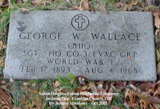 - Wallace, George W, Ohio, SGT HQ CO 3 EVAC GRP, World War I, Feb 17, 1893-Aug 4, 1968