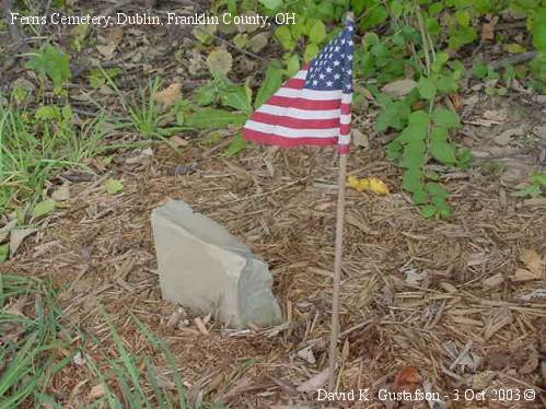 Unfortunately the sign, the flowers, a broken stone, and a flag intended to commemorate one or more long gone soldiers are all that remain of the Ferris Cemetery, established in 1848. Located on the east side of Riverside Drive between Emerald Parkway and Bright Road, this sign has been erected since 1981 when the cemetery was listed by the Franklin County Genealogical society as "no evidence remains." Behind the green undergrowth and trees seen here is a farmers field and if there were ever stones commemorating the lives of those buried here they are long gone.