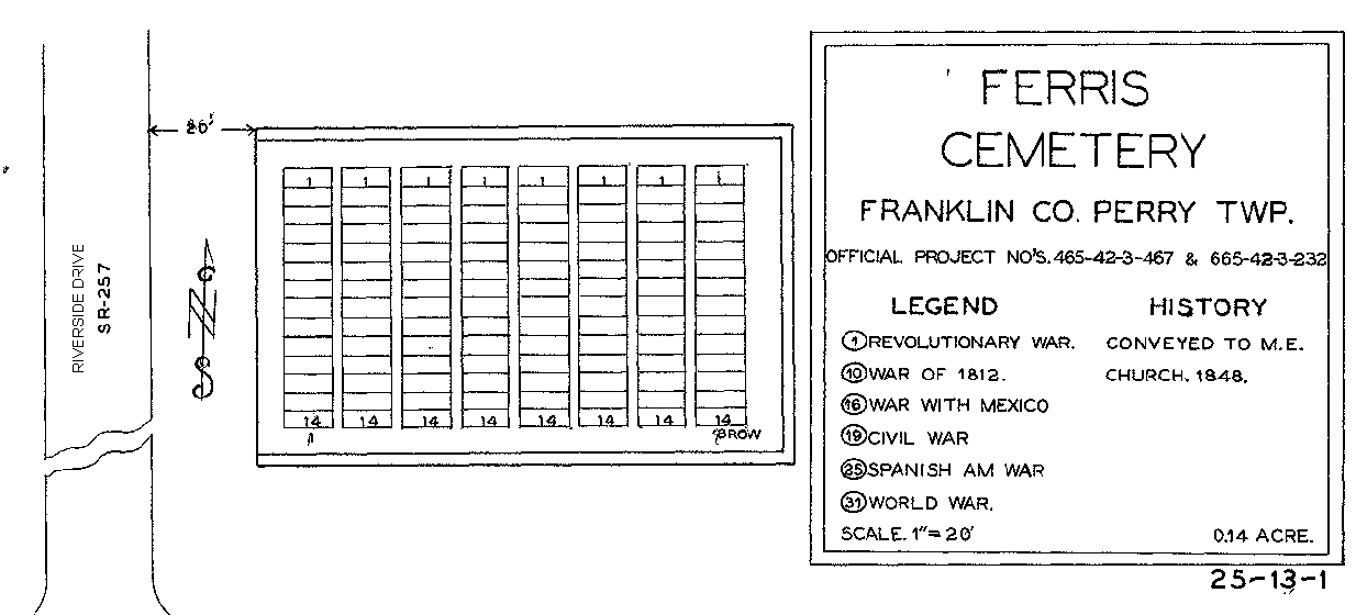 The WPA Map (graphic is not shown at the original scale) indicates that there is enough space for eight rows of fourteen graves to each row. It also shows no veteran burials, nor are any Ferris Cemetery veteran burials listed with the Franklin County Veteran Grave Registration.