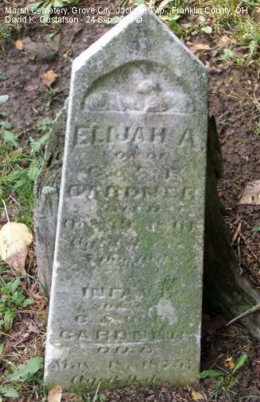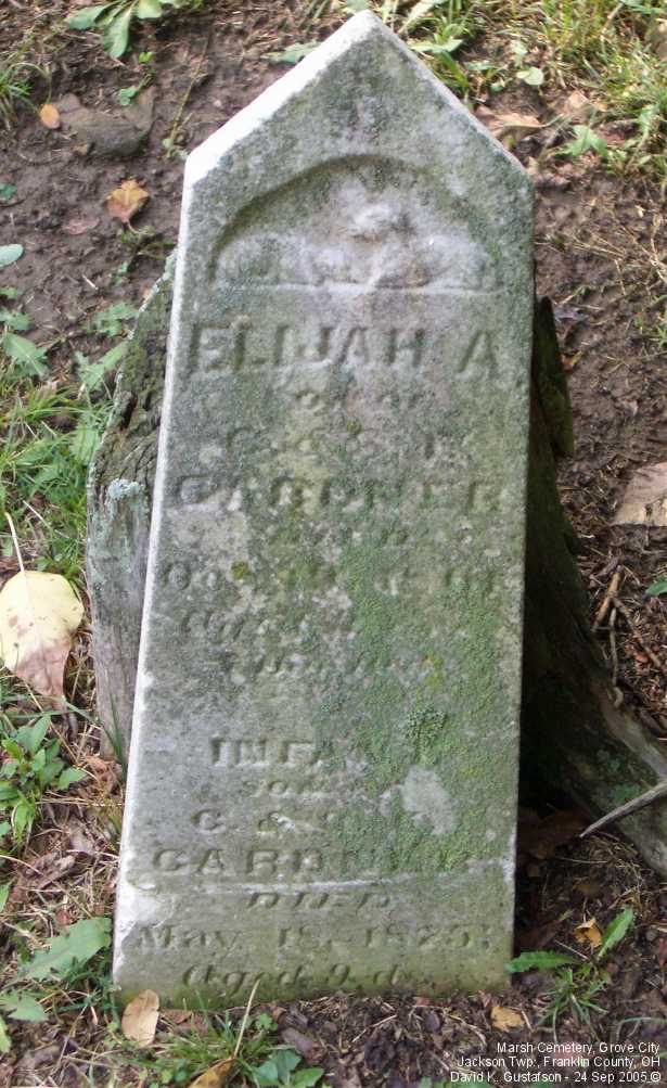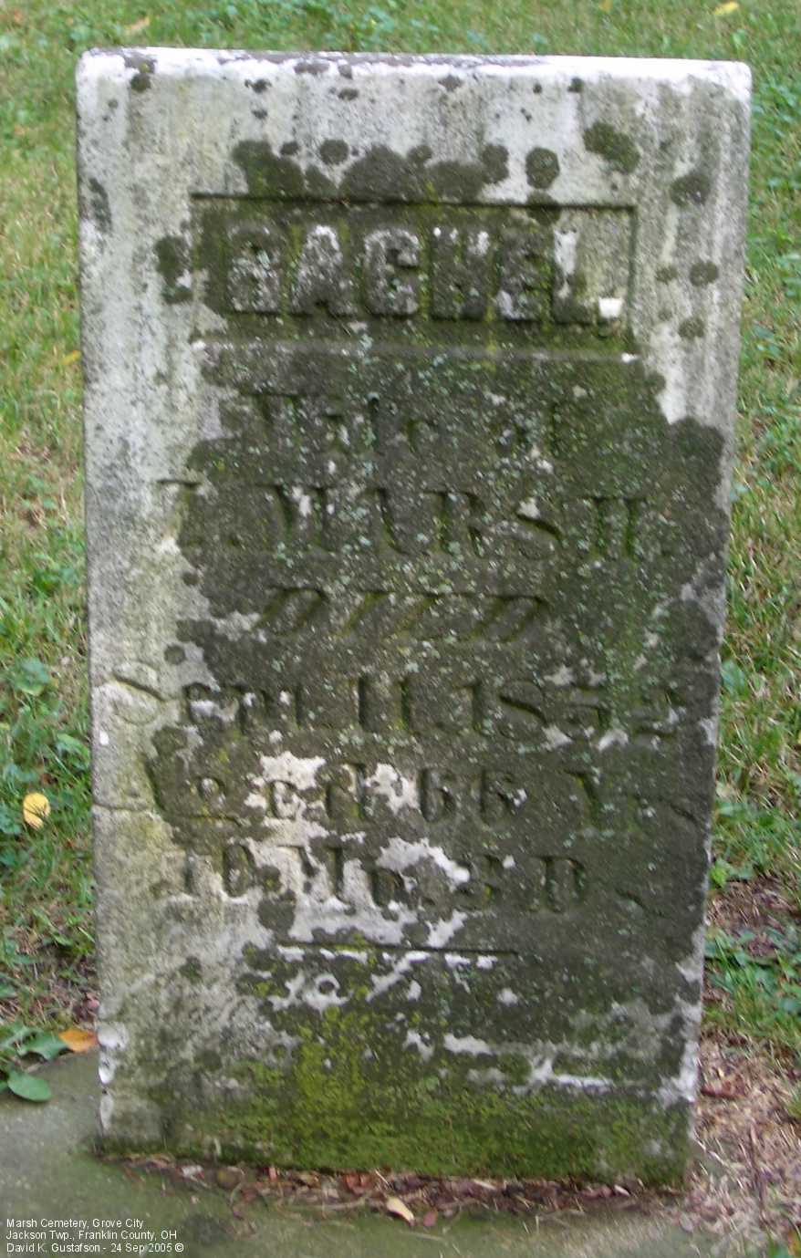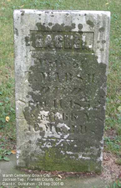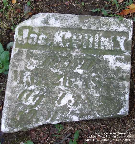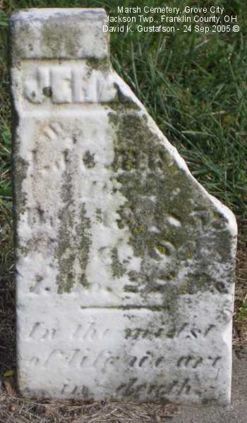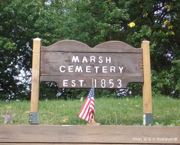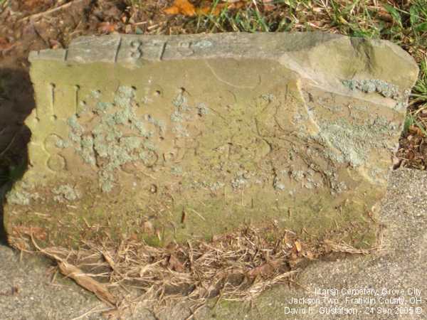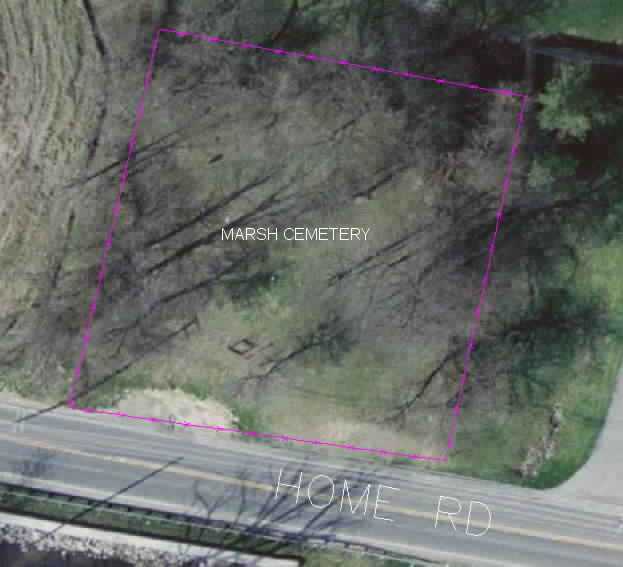 Gravestone PhotographsLocated near the top of a hill on the north side of Home Road about one tenth (.1) of a mile west of Gantz Road, this small cemetery has very few stones still standing. Of course, it's possible that the majority of the graves never had gravestones. According to the sign located about half way up the embankment the cemetery was established in 1853, though there was at least one interment before then, in 1852. The cemetery is very well cared for. A quick online search of census records indicates that the Marsh family relocated to Jackson Township from Maryland. Aerial Photo of Cemetery,
